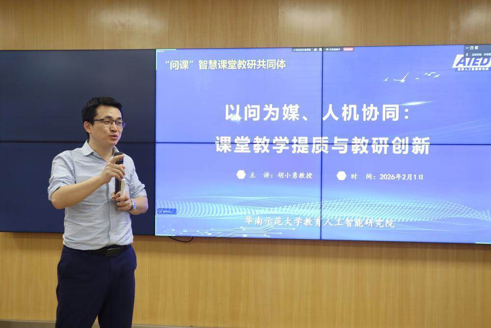 教育人工智能研究院常务副院长胡小勇教授作《以问为媒、人机协同:课堂教学提质与教研创新》主旨讲座,系统介绍了问课“是什么”“问什么”和“如何问”等研究成果,深入阐释了研究团队首创的WISE课堂研究框架与AIED协同教研模式,为共同体成员单位扎根智慧课堂开展问课教研提供了兼具理论高度与实践价值的指引。